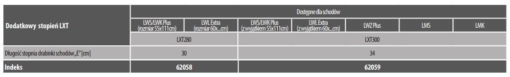 Dodatkowy stopień LXT ułatwia wyjście na poddasze, zwiększając tym samym komfort i bezpieczeństwo dostępu do pomieszczeń strychowych. Wykonany z drewna stopień LXT standardowo montowany jest pomiędzy ostatnim stopniem drabiny a podłogą na poddaszu. Polecany jest szczególnie w sytuacjach, gdy na schodach zamontowano luk górny lub osadzono je w grubym stropie.