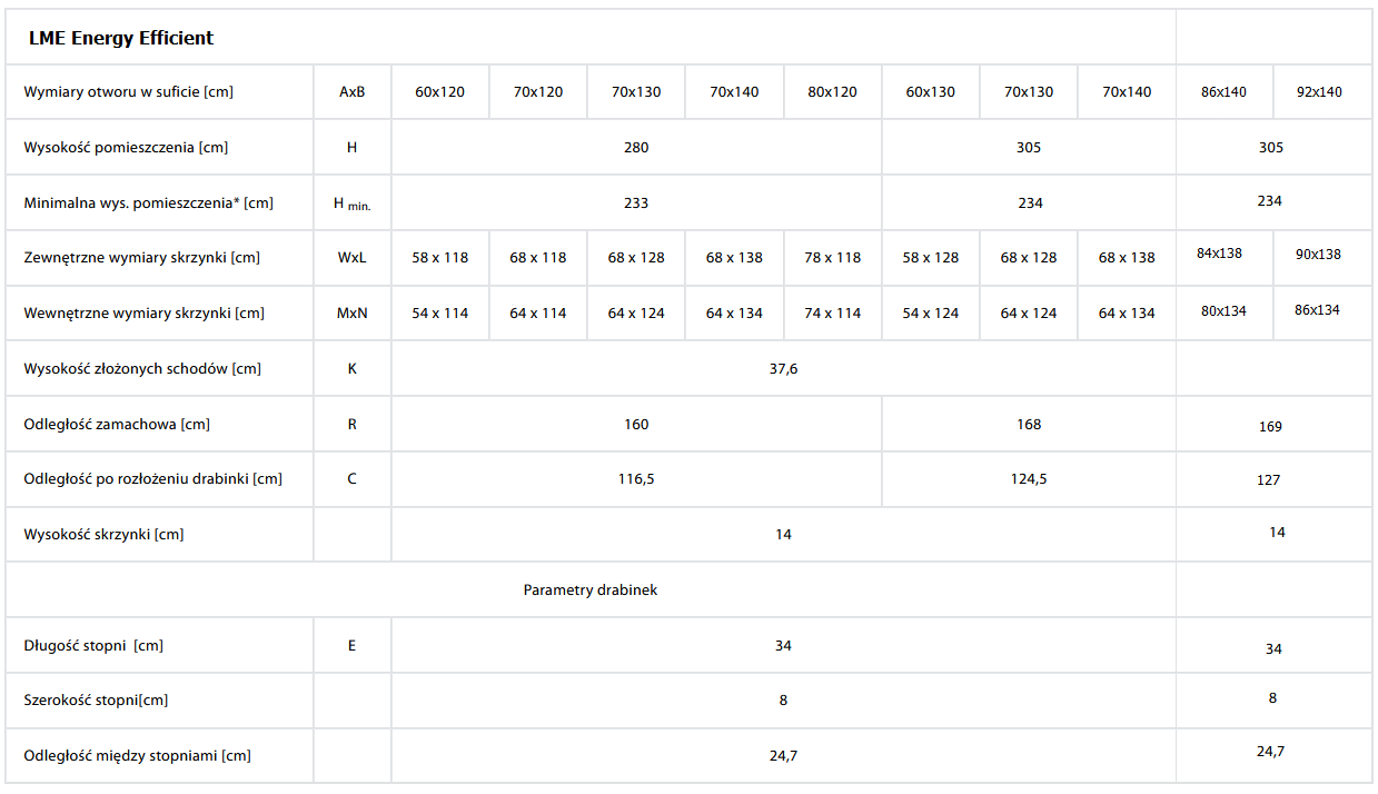 Schody strychowe LME Energy Efficien produkowane są w rozmiarach: