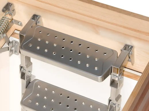 - Okucia: Zaczep sprężyny usztywnia skrzynkę i zapobiega zmianie przekątnych skrzynki. Dzięki temu, że skrzynka nie deformuje się schody można bezproblemowo używać przez wiele lat. Specjalna konstrukcja zawiasów zwiększa sztywność elementów ruchomych.