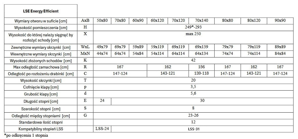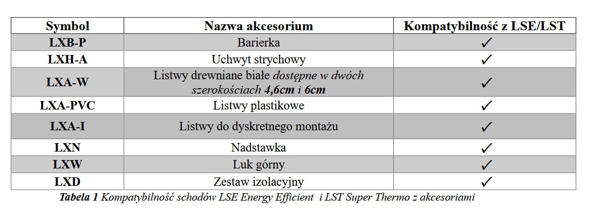 W tabeli poniżej przedstawiono kompatybilność nowych schodów LSE Energy Efficient i LST Super Thermo z akcesoriami do schodów strychowych FAKRO. Szczegółowe informacje odnośnie montażu akcesoriów dostępne w aktualnych folderach produktu.