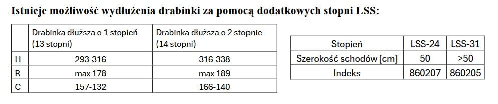 - Możliwość wydłużenia drabinki do wyższych pomieszczeniach do 336 cm przez dołożenia dodatkowych stopni LSS.