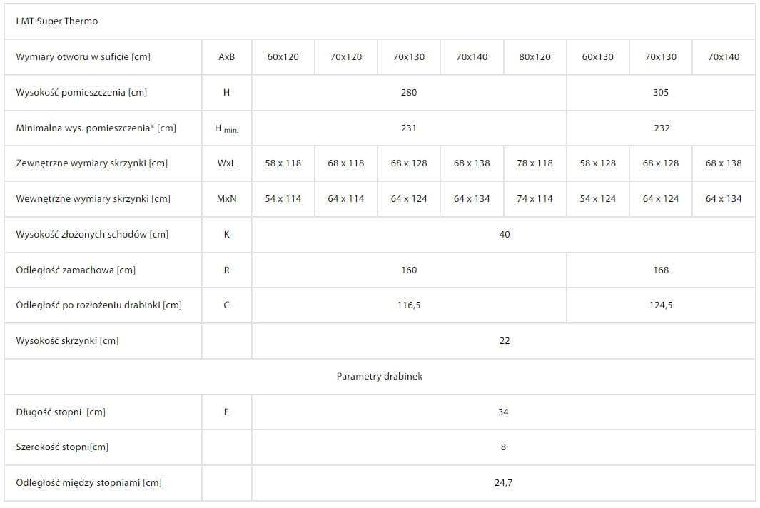 LMT Super Thermo to schody strychowe z metalową drabinką o najlepszych parametrach termoizolacyjnych, które należą do nowej linii schodów strychowych. Klapa o grubości 8 cm jest w całości wypełniona materiałem termoizolacyjnym, a skrzynka została wyposażona w 3 uszczelki zapewniające doskonałą szczelność. Drabina schodów LMT posiada stopki z możliwością regulacji pozwalające na łatwiejsze dopasowanie drabinki do wysokości pomieszczenia. Schody zostały zaprojektowane z dbałością o każdy detal i pozwalają na bezpieczne, komfortowe wejście na strych przy zapewnieniu najwyższych parametrów termoizolacyjnych.