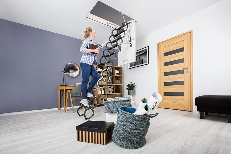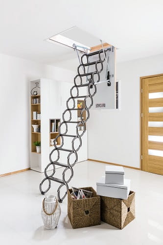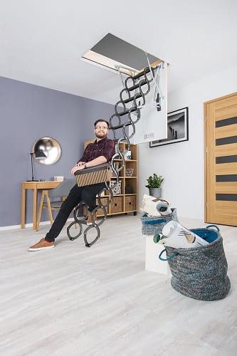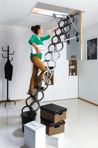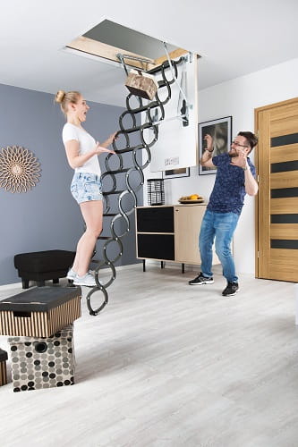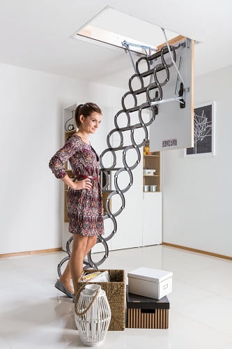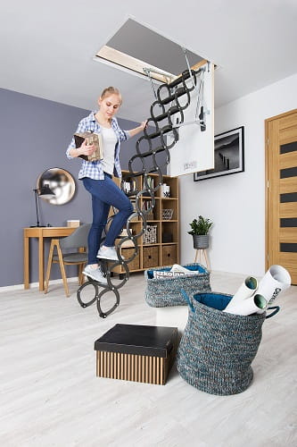 Nożycowa konstrukcja drabinki pozwala w łatwy sposób dopasować jej długość do wysokości pomieszczenia bez konieczności docinania. Dodatkowo umożliwia złożenie drabinki do małych rozmiarów, dając tym samym możliwość zamontowania schodów w otworach o niewielkich wymiarach (najmniejszy rozmiar schodów wynosi 50 x 80 cm). Policzki w kształcie litery „S” nadają schodom nowoczesny wygląd i ułatwiają ich użytkowanie pełniąc rolę poręczy.