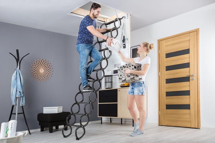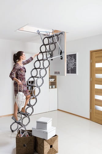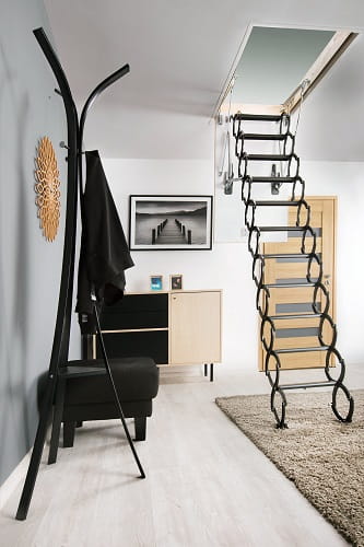 Nożycowa konstrukcja drabinki pozwala w łatwy sposób dopasować jej długość do wysokości pomieszczenia bez konieczności docinania. Dodatkowo umożliwia złożenie drabinki do małych rozmiarów, dając tym samym możliwość zamontowania schodów w otworach o niewielkich wymiarach (najmniejszy rozmiar schodów wynosi 50 x 80 cm). Policzki w kształcie litery „S” nadają schodom nowoczesny wygląd i ułatwiają ich użytkowanie pełniąc rolę poręczy.