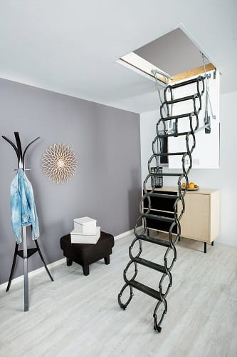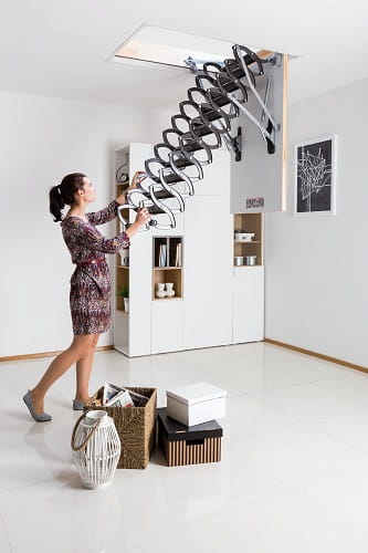 Nożycowa konstrukcja drabinki pozwala w łatwy sposób dopasować jej długość do wysokości pomieszczenia bez konieczności docinania. Dodatkowo umożliwia złożenie drabinki do małych rozmiarów, dając tym samym możliwość zamontowania schodów w otworach o niewielkich wymiarach (najmniejszy rozmiar schodów wynosi 50 x 80 cm). Policzki w kształcie litery „S” nadają schodom nowoczesny wygląd i ułatwiają ich użytkowanie pełniąc rolę poręczy.