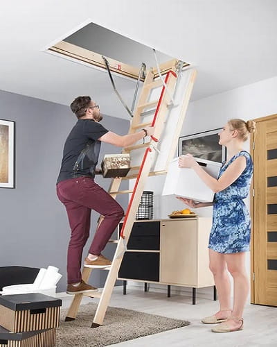 LWL Extra to drewniane schody strychowe nowej konstrukcji o podwyższonych parametrach termoizolacyjnych. Dla zwiększenia bezpieczeństwa i komfortu użytkowania schody zostały wyposażone w dodatkową poręcz, zamontowaną do środkowego segmentu raz mechanizm odciążający, który wspomaga składanie i rozkładanie drabiny.