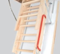 Schody OLE MAXI Thermo to drewniane segmentowe schody strychowe super termoizolacyjne o najlepszych właściwościach termoizolacyjnych, wyposażone w białą klapę, podwójny system uszczelek oraz poręcz umożliwiającą komfortowe korzystanie ze schodów.